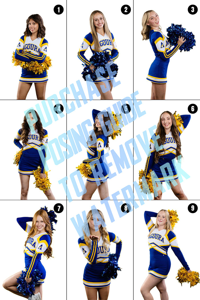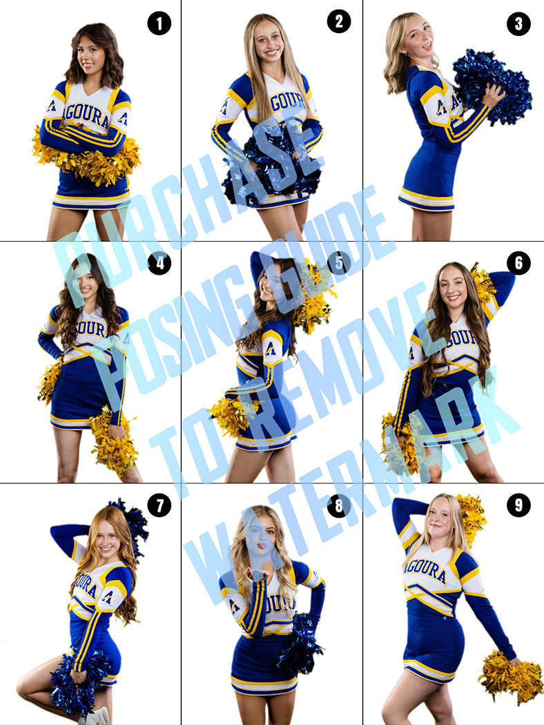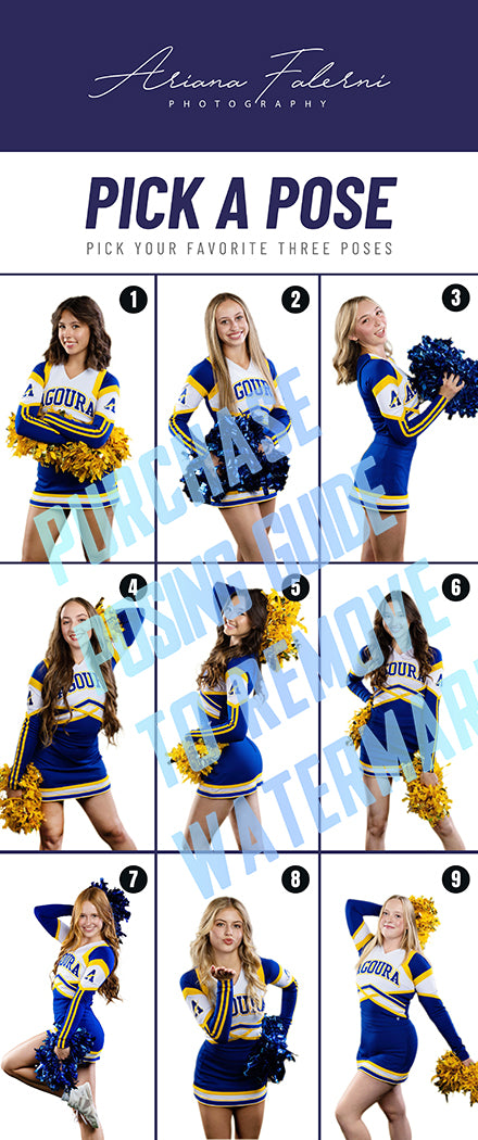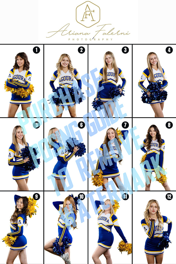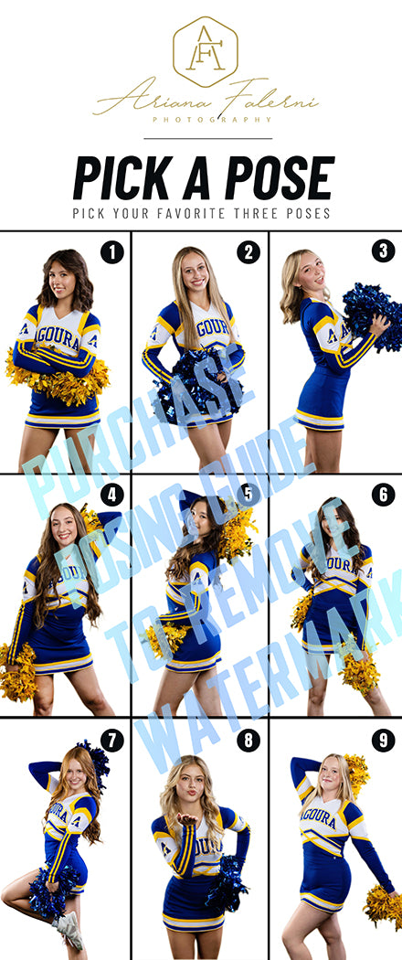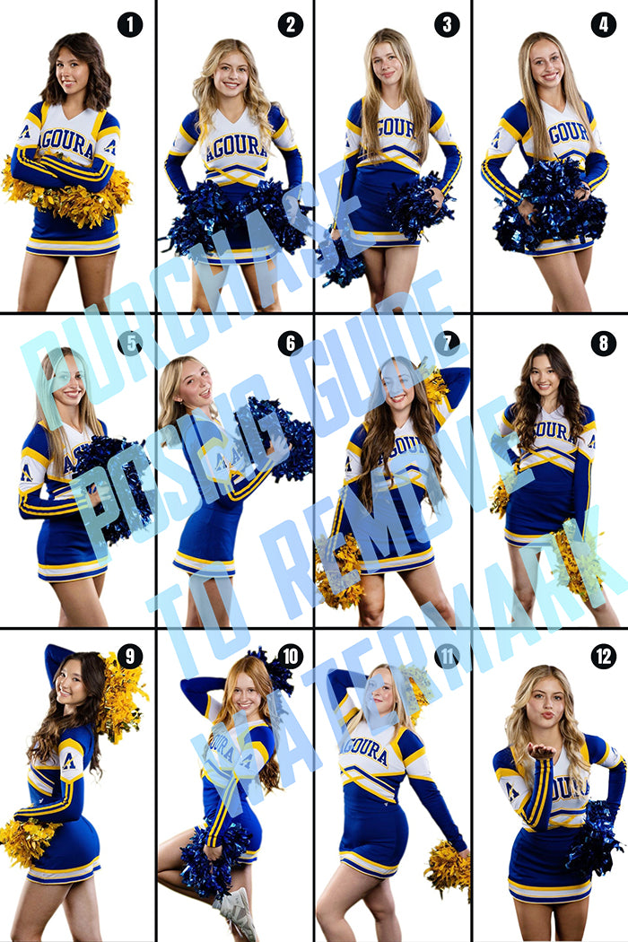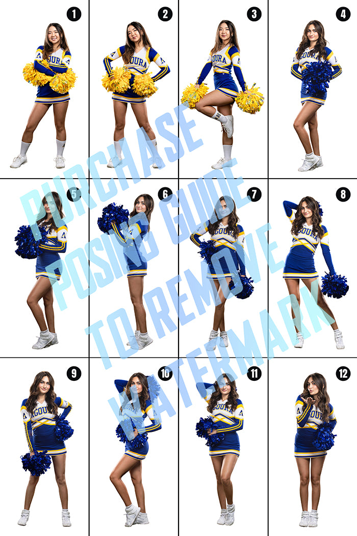 This sideline cheer digital posing guide has 9-12 unique poses in 3 popular print sizes as well as all the ingredients you need to make your OWN posing posters and retractable stands! These poses were selected specifically as they work well in senior banners – they are all poses where the arms and legs are not too far from the body and allow the athlete image to be large in the banner design.